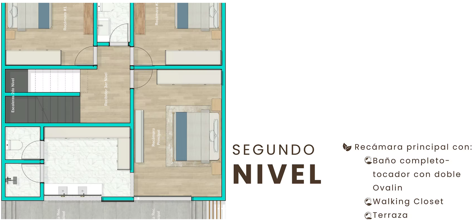 Su distribución está diseñada para aprovechar cada espacio al máximo: Las habitaciones se encuentran situadas en el segundo nivel, lo que proporciona privacidad.