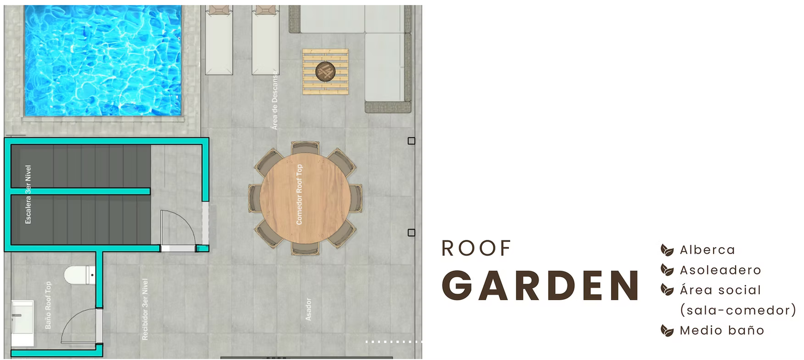En tu roofgarden, podrás tomar el aire, descansar dentro de la mini alberca, realizar una parrillada o disfrutar de la vista.