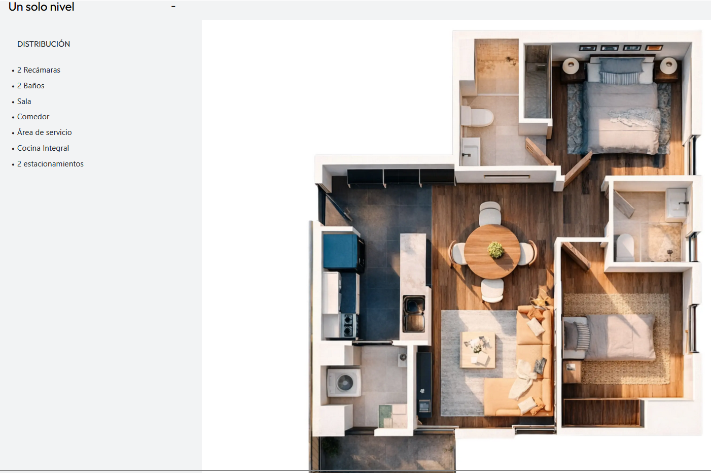 - Dos recámaras, con la principal contando con baño completo para brindar privacidad y confort.