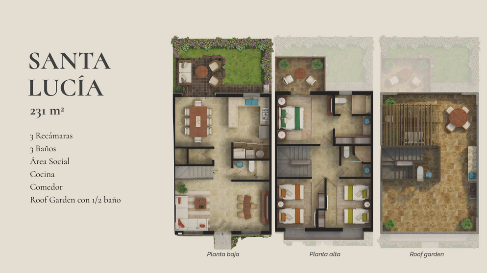 231 m² / 3 y 4 recámaras / 3 baños + Medio baño en Roof garden / 1 estacionamiento
