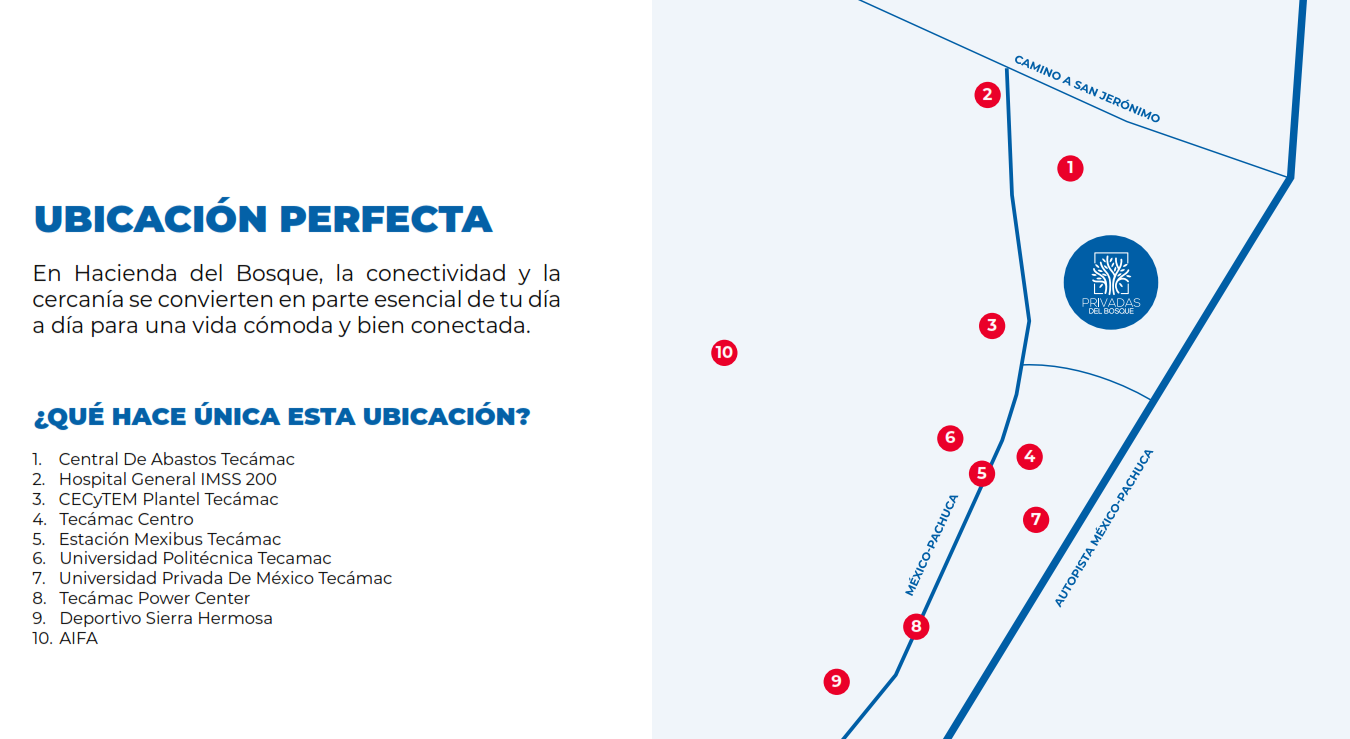 Excelente Ubicación en Tecámac, Estado de México: Privadas del Bosque se encuentra en una zona estratégica de Tecámac, con fácil acceso a las principales vías de comunicación, servicios y el Aeropuerto Internacional Felipe Ángeles (AIFA).